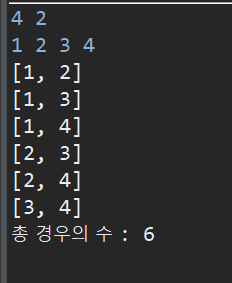 조합 : nCr이라고 표현되며, n개의 입력받은 수 중 r개를 모두 뽑아 순서없이 나열하는 것(1<=r<=n)