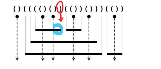 다음과 같이 쇠막대기의 닫힌 괄호(빨갛게 칠해놓은 부분)을 만난 경우 남은 쇠막대기(파랗게 칠해놓은 부분)는 +1 해주면 되는 것을 확인할 수 있습니다.