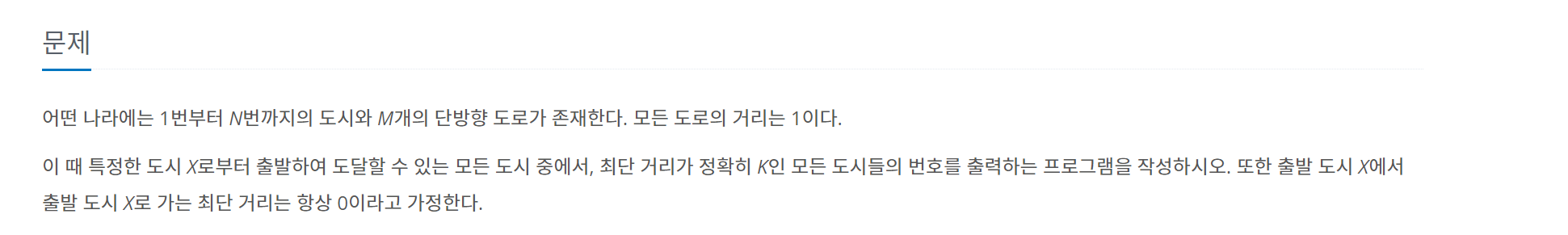 한 정점에서 다른 정점으로 가는 최단 거리의 문제입니다. 다음과 같이 모든 도로의 거리는 1이라는 조건이 있습니다. 이를 통해 BFS나 다익스트라로 문제를 풀어볼 수 있음을 알 수 있었습니다.