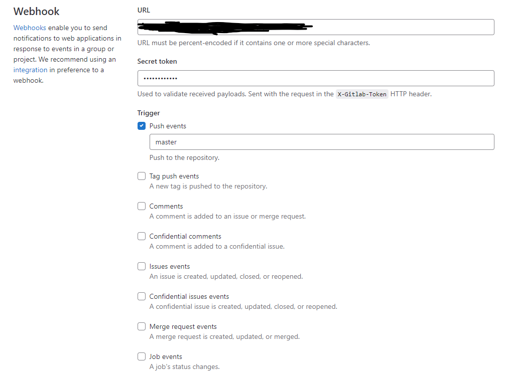 다음과 같이 깃랩에 push 될때 build가 자동으로 이루어지게 설정한다. 이때, GitLab webhhok URL을 기억해 두자! 이후에 GitLab에서 webhook을 등록하기 위해 사용한다.