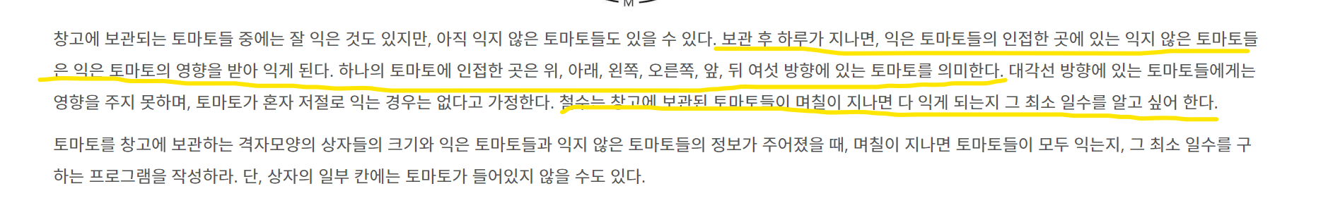 다음과 같은 조건이 주어진다. 이때, 익은 토마토들의 인접한 곳에 있는 익지 않은 토마토들이 하루가 지날 때마다 익은 토마토로 변한다는 조건으로 인해 전형적인 BFS 문제임을 파악했다.