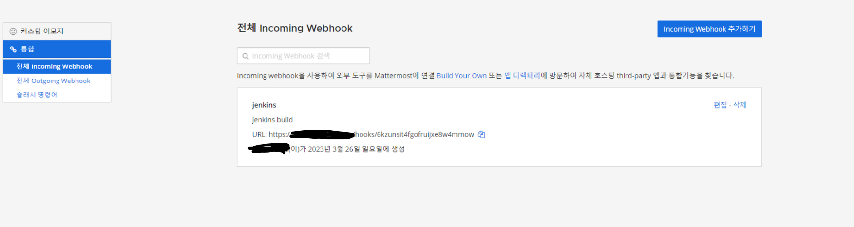 다음과 같이 Mattermost에서 incoming webhook을 만들어줍니다. 이 채널을 통해 Jenkins의 알림을 받을 수 있게 됩니다.