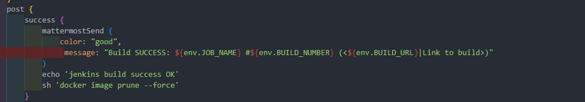 저는 Jenkinsfile에서 Build에 성공, 실패 시 Mattermost에 알림을 보내는 부분을 추가했습니다. 단순하게 success 시에 mattermostSend 부분을 추가했습니다. 다른 방법이 있는지는 모르겠네요