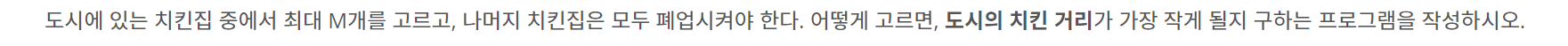 해당 조건을 보며 치킨 집 중에서 M개에 대해 나올 수 있는 경우의 수를 전부 확인하여, 도시의 치킨 거리를 구해야겠다고 생각했다.